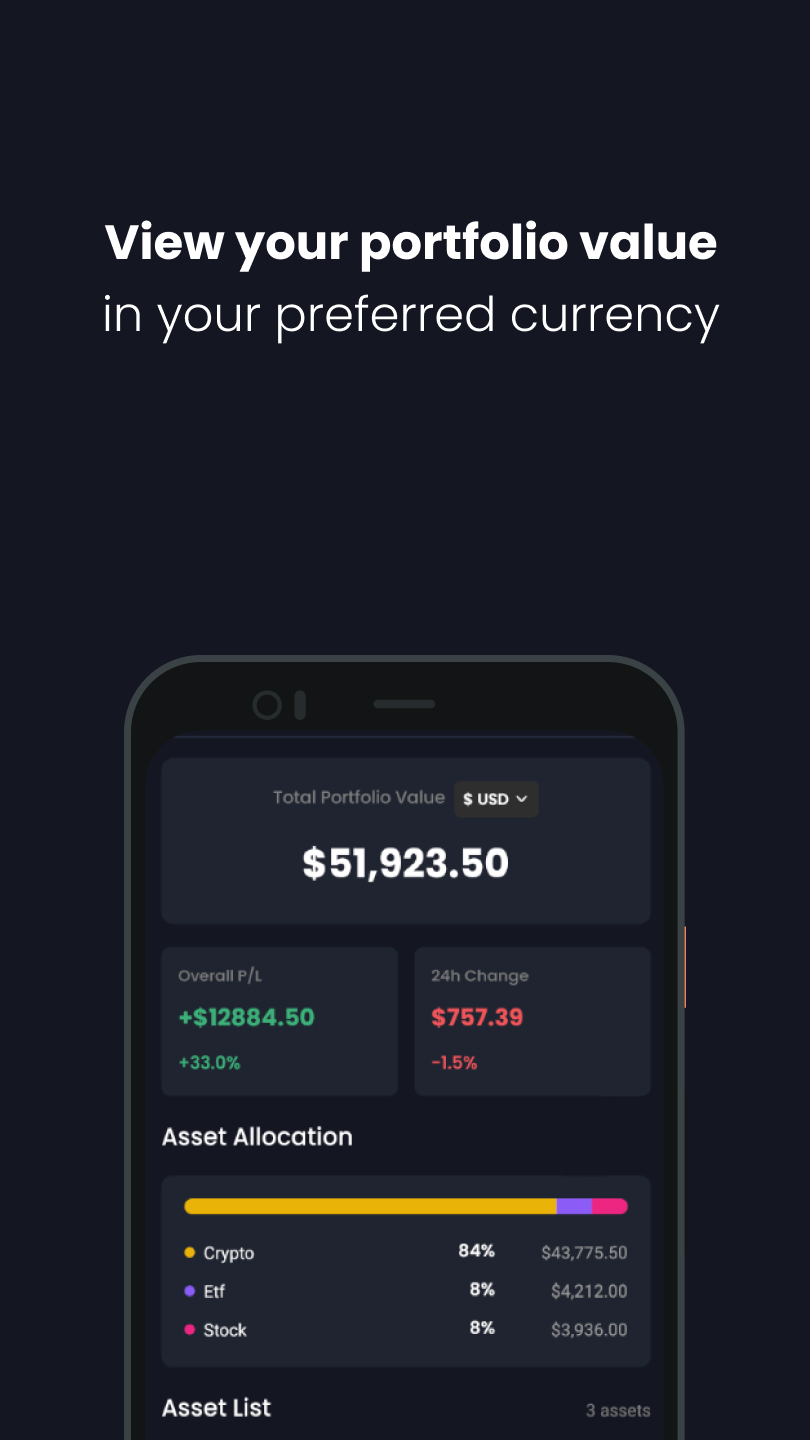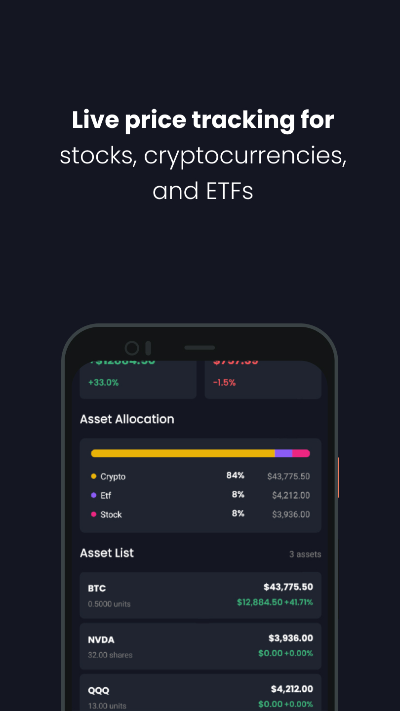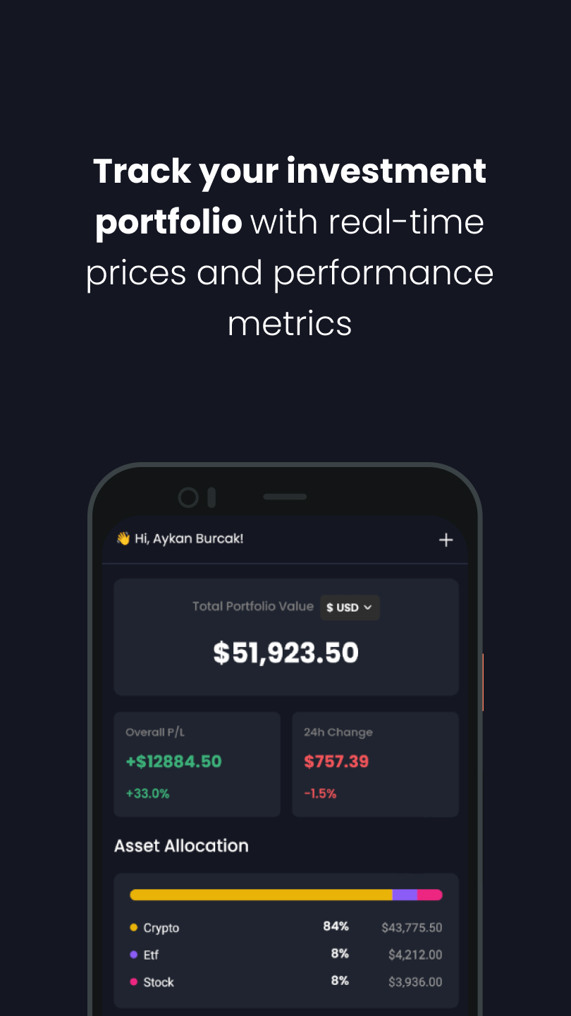 FinTrack, tüm yatırımlarınızı tek bir yerde takip etmenizi sağlayan güçlü ama kullanımı kolay bir portföy takip uygulamasıdır. Hisse senetleri, kripto paralar, ETF’ler veya diğer varlıkları izliyor olun, FinTrack portföyünüzün performansına dair gerçek zamanlı içgörüler sunar